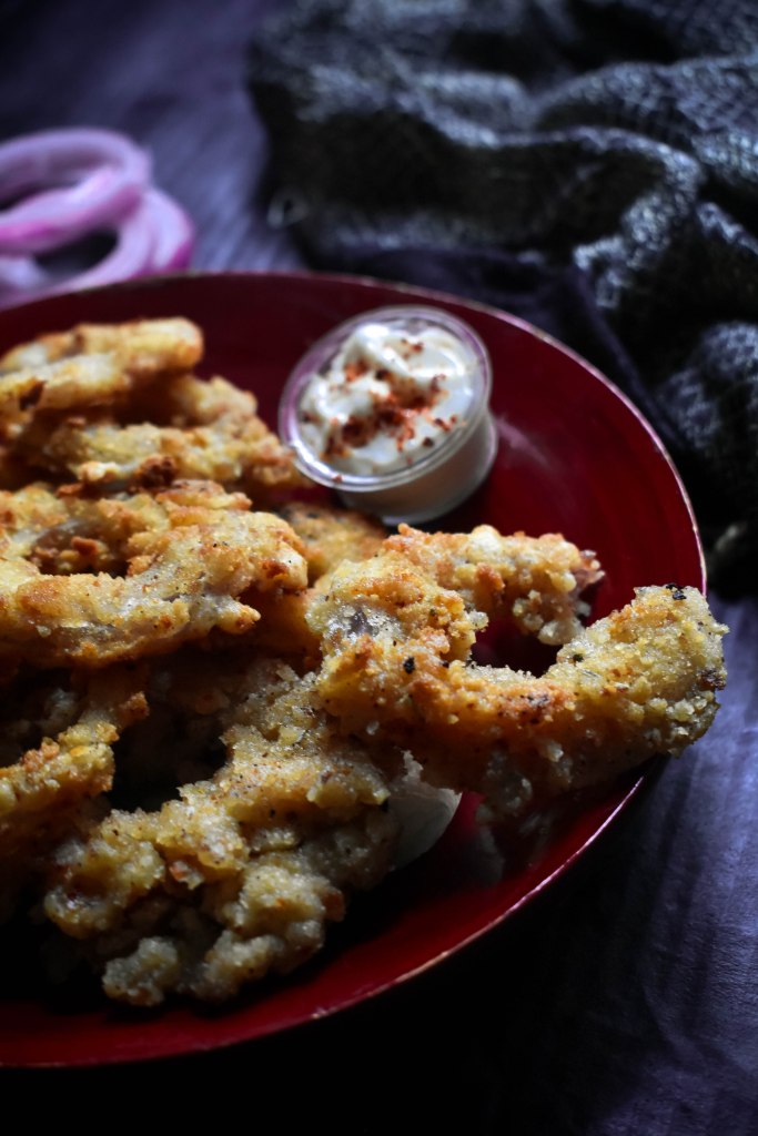 It was a cold wintery evening , when I craved for something hot and crispy and my fridge was wiped clean as we were travelling the other day, and this is how my jiffy onion rings met the hot tea on a wintery evening.